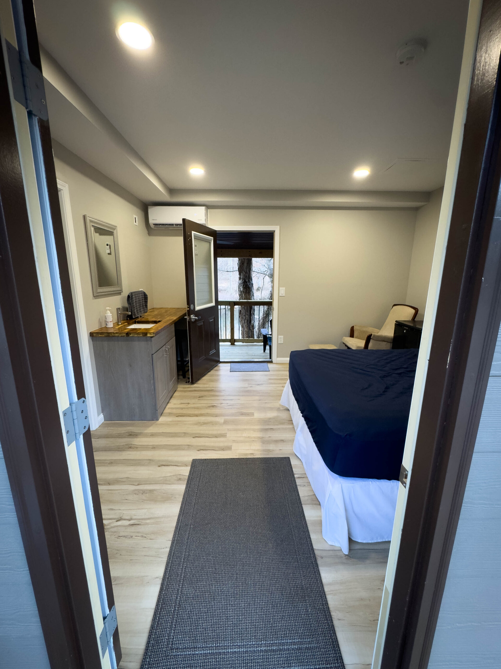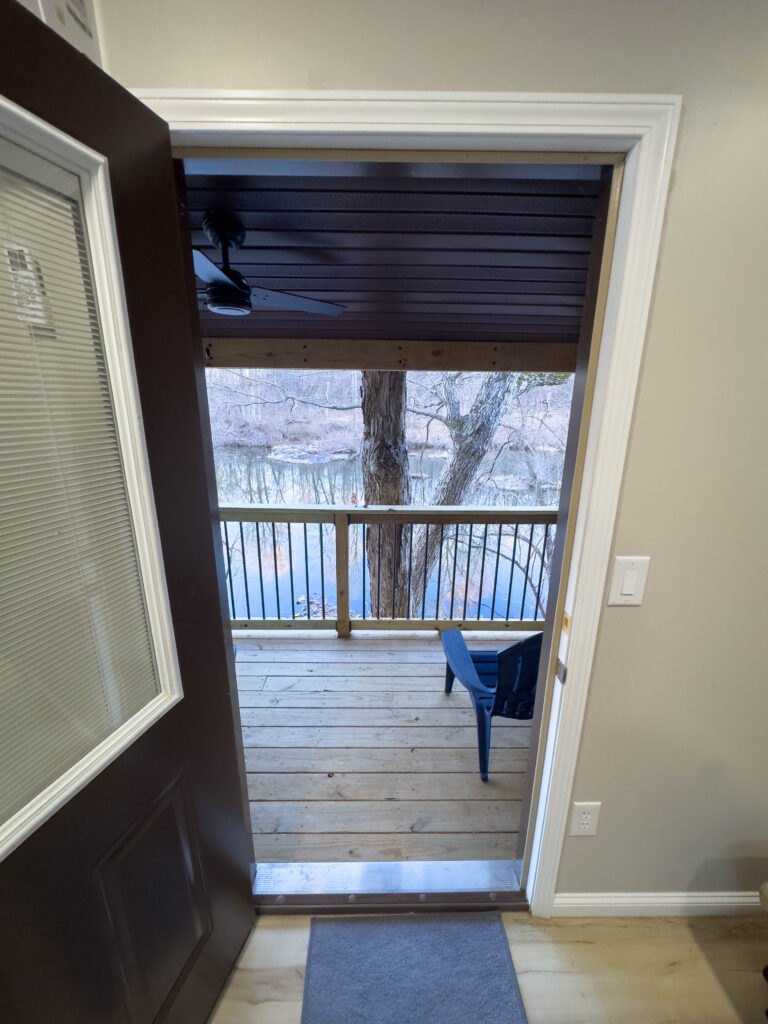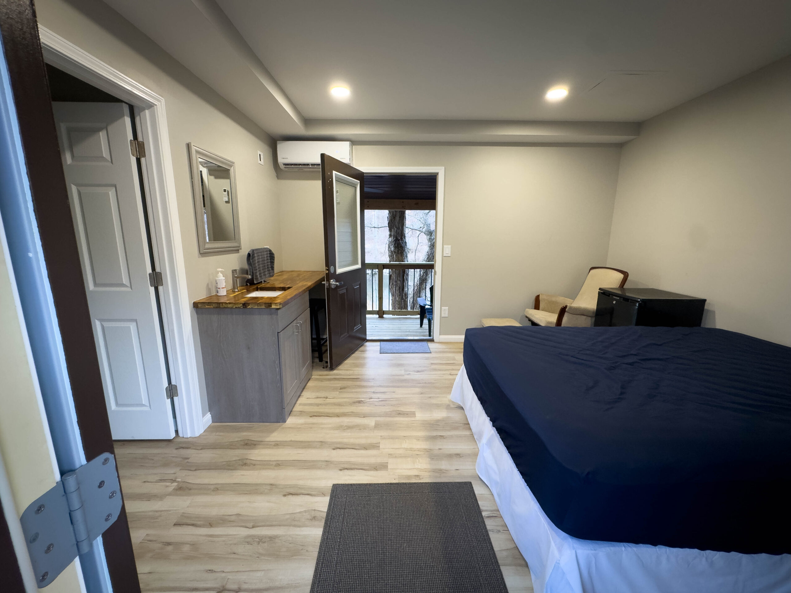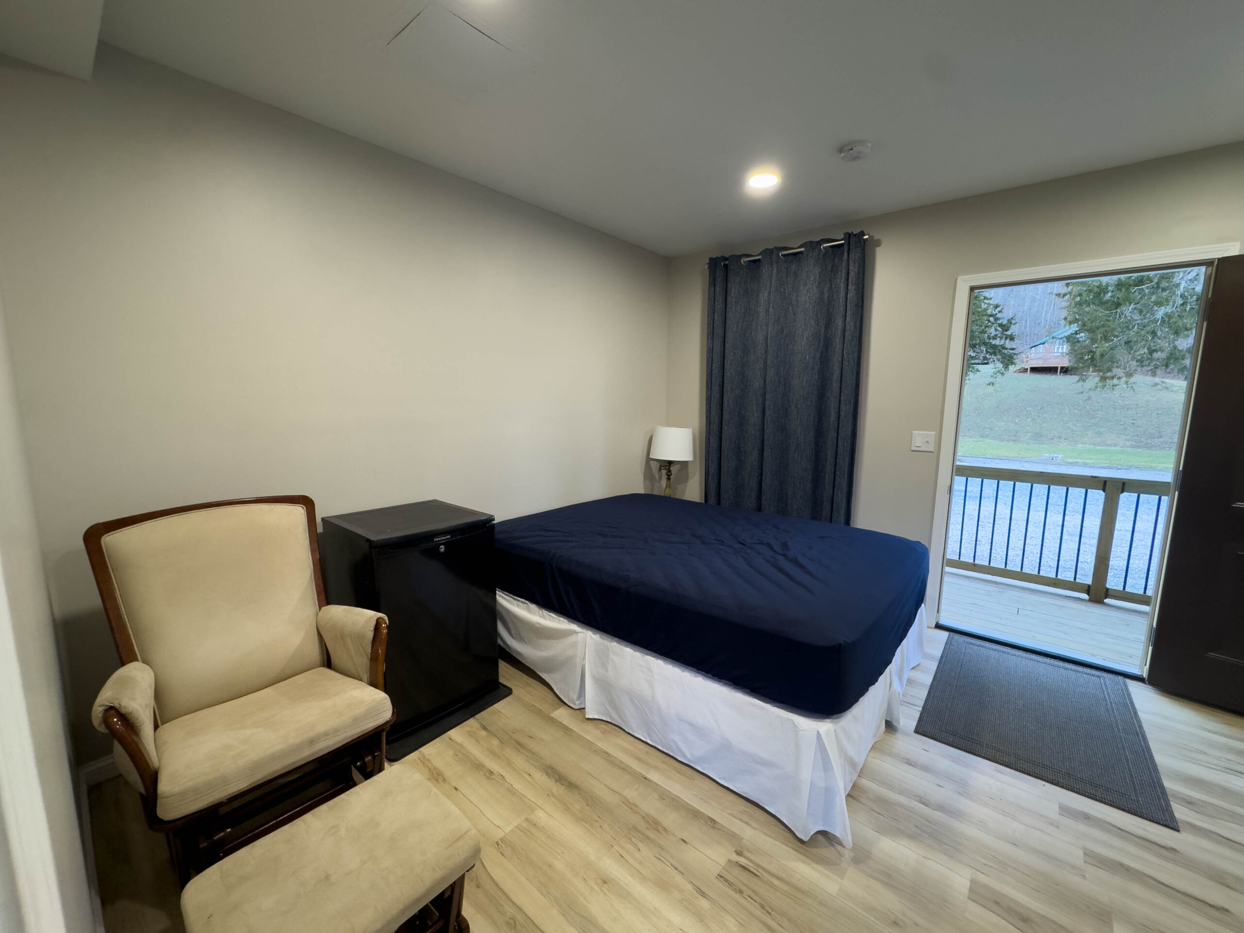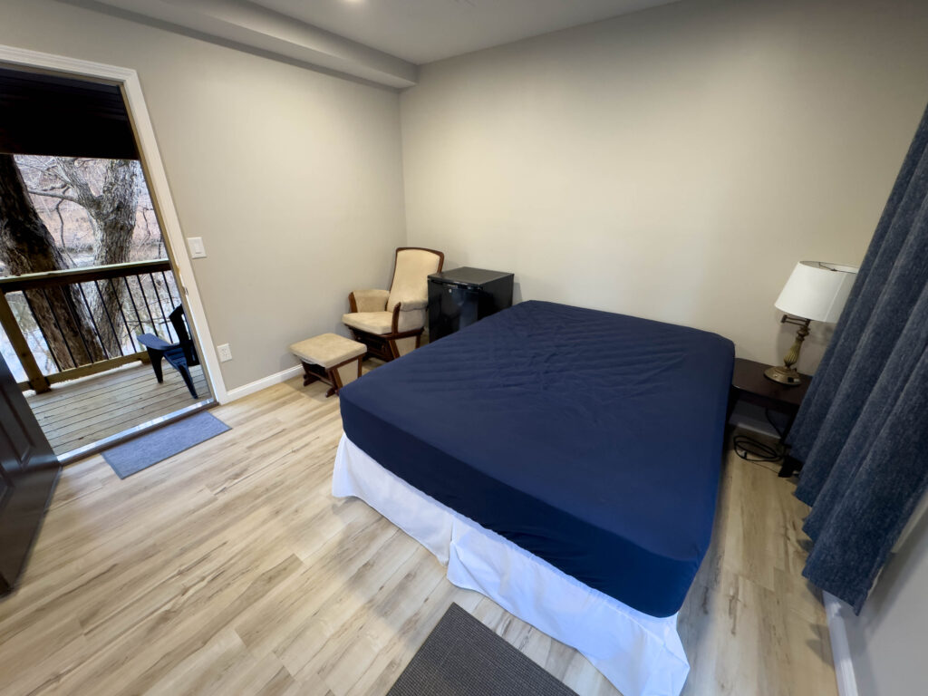 Additional features include high-speed internet (100 Mbps down/up) available at no extra cost to guest groups, a mini-fridge for added convenience, and rear door access to a deck overlooking Stouts’ Creek – a perfect place to relax and enjoy the natural surroundings.