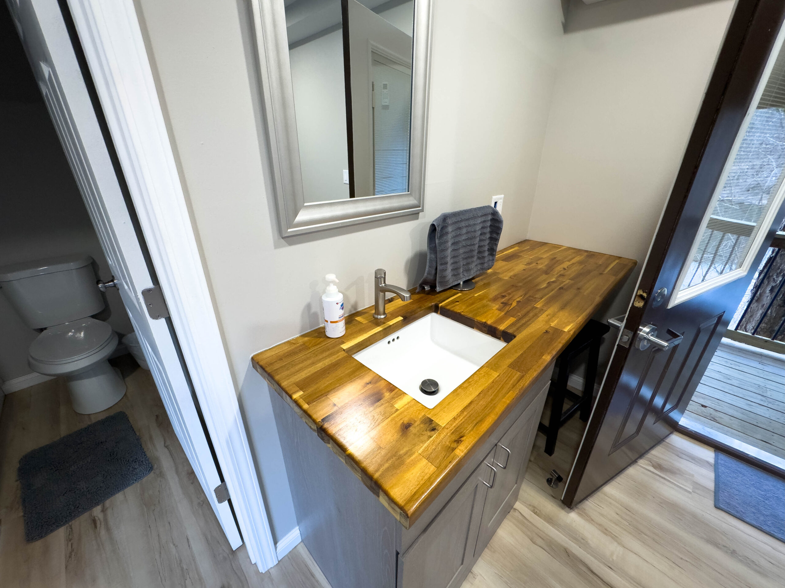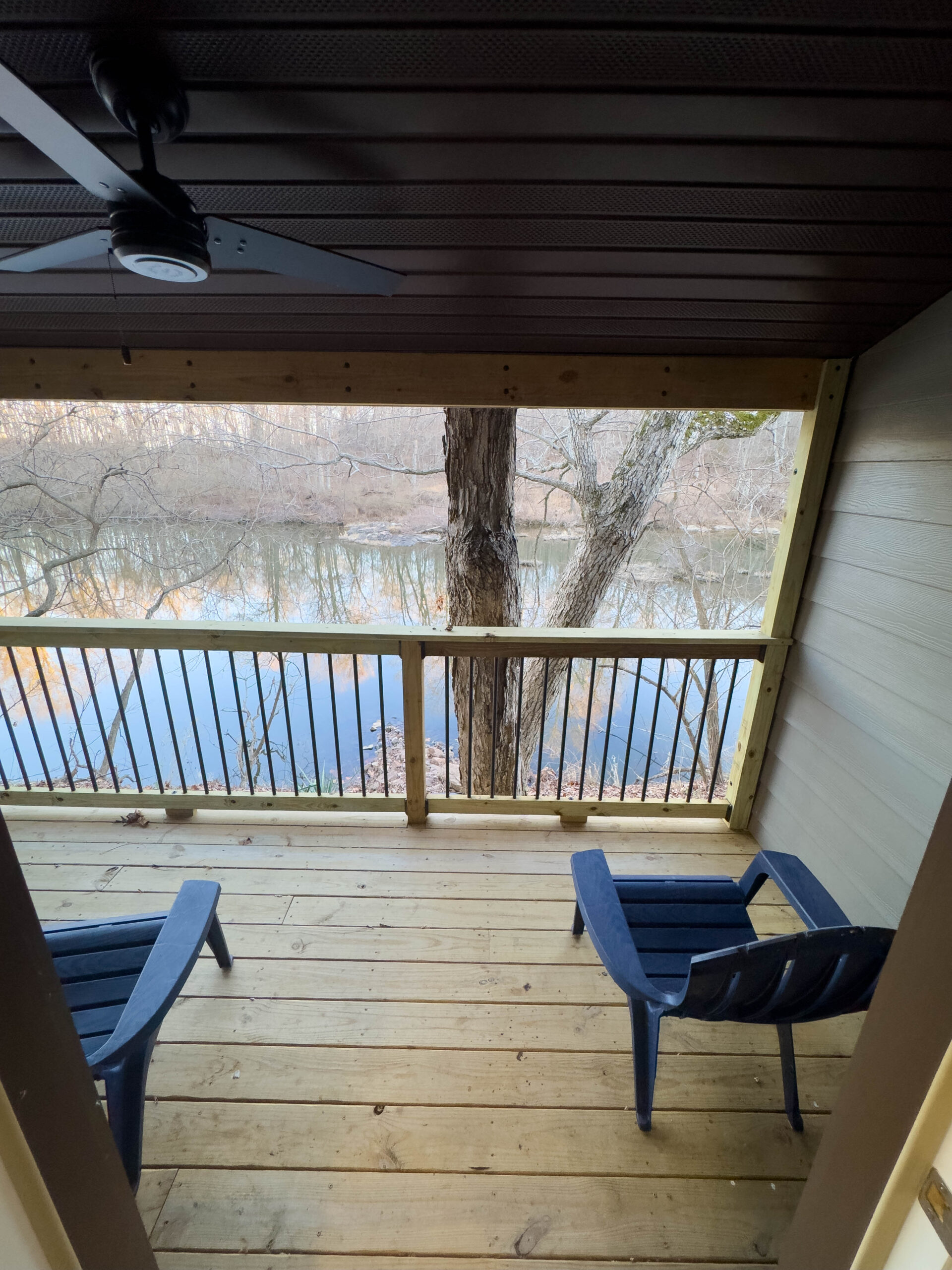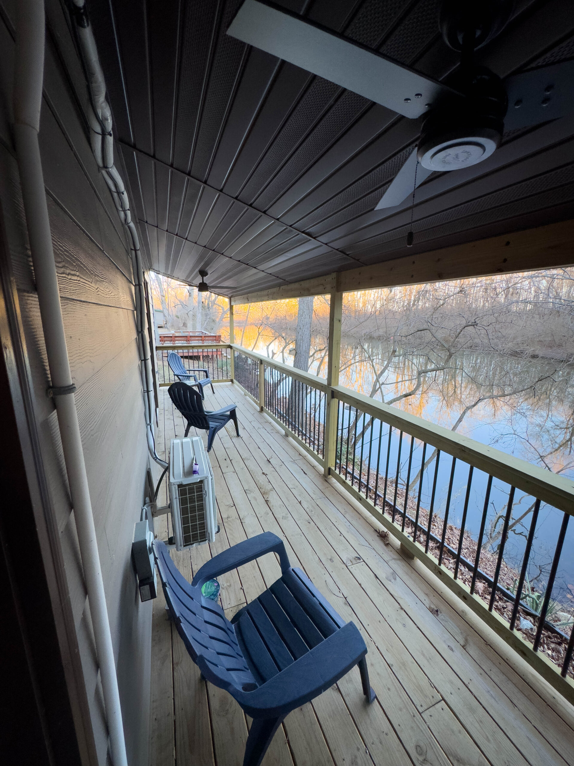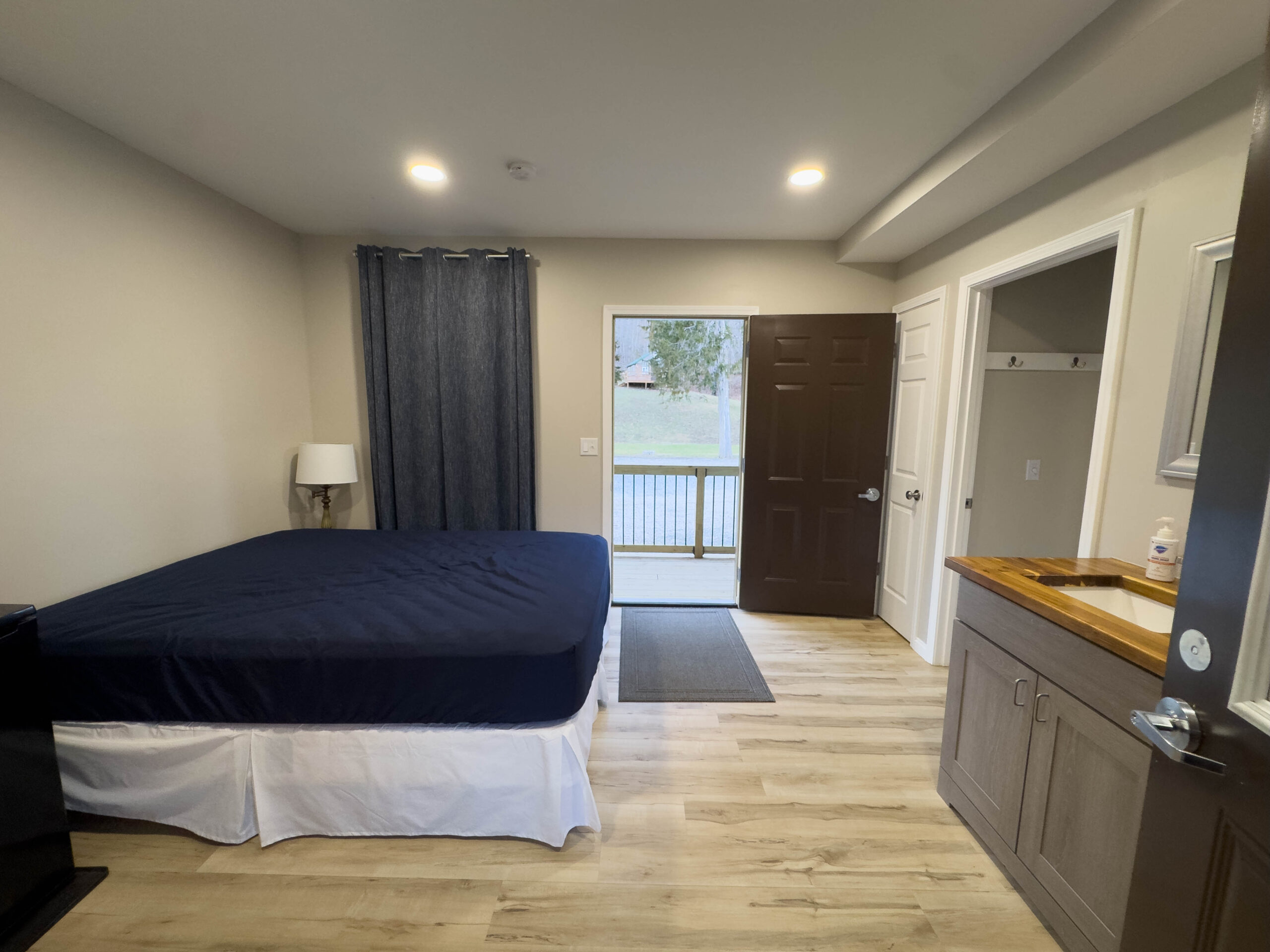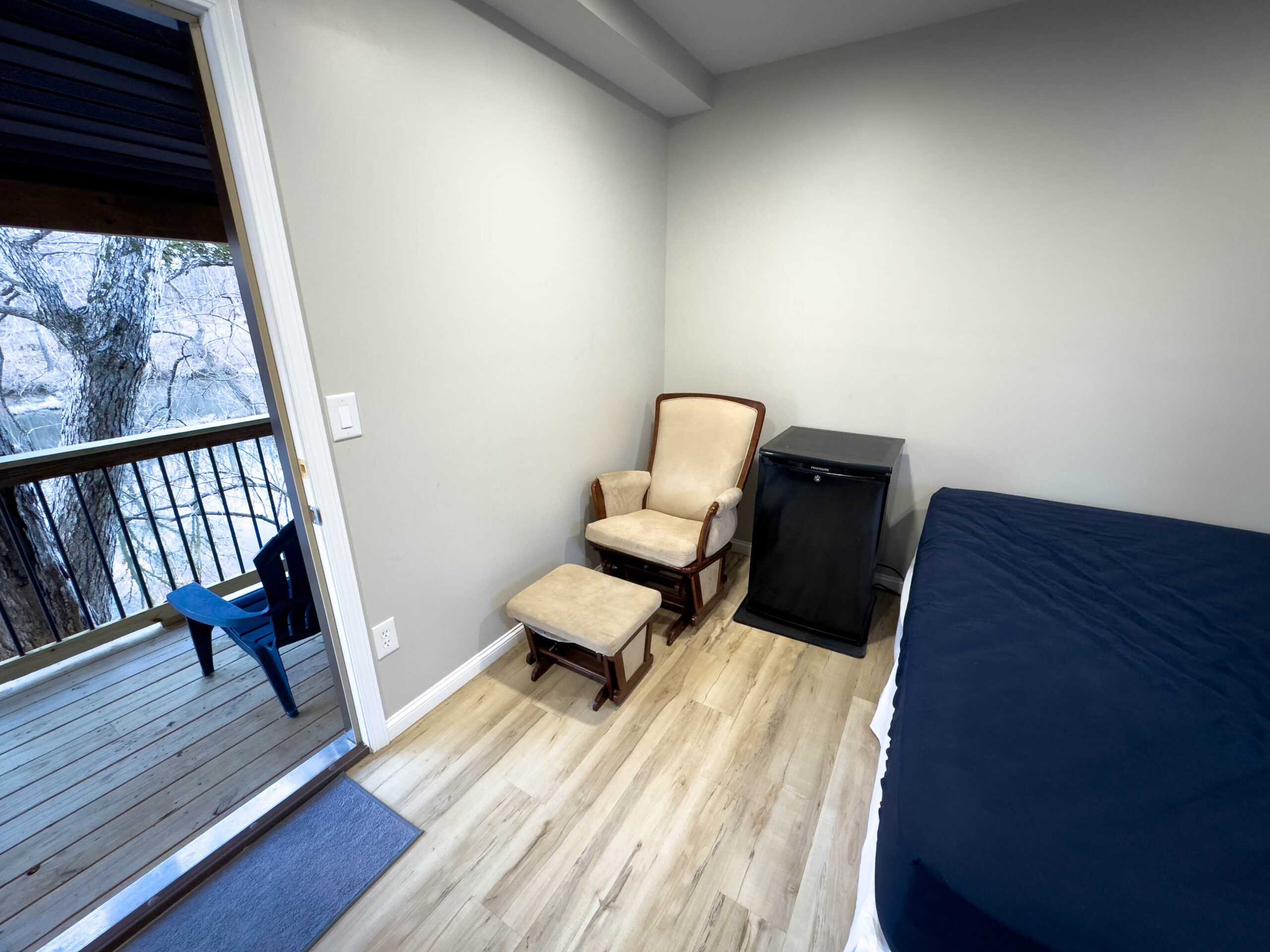 Additional features include high-speed internet (100 Mbps down/up) available at no extra cost to guest groups, a mini-fridge for added convenience, and rear door access to a deck overlooking Stouts’ Creek – a perfect place to relax and enjoy the natural surroundings.