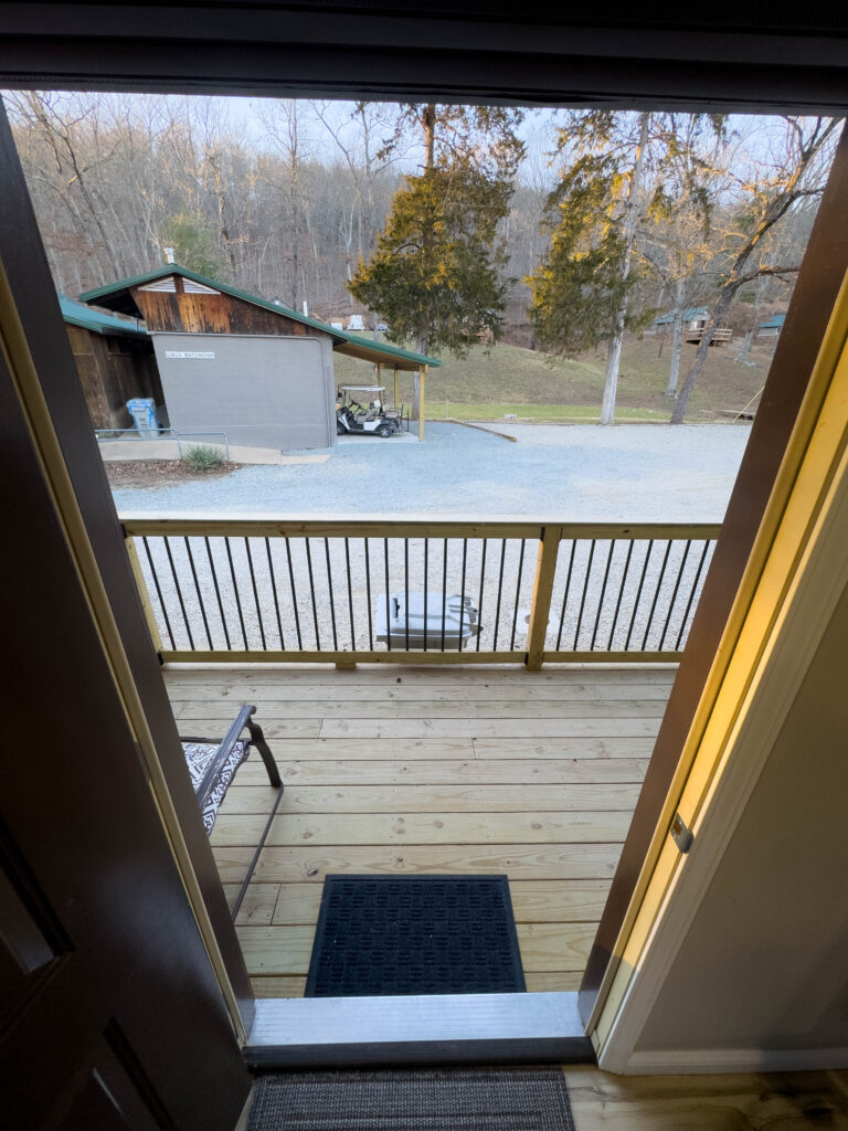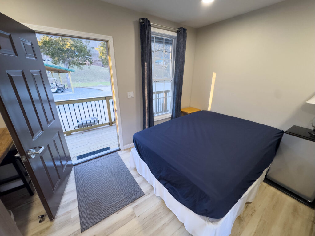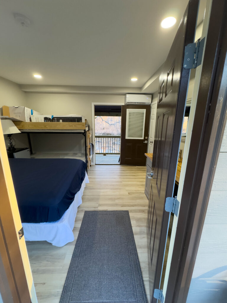 Additional features include high-speed internet (100 Mbps down/up) available at no extra cost to guest groups, a mini-fridge for added convenience, and rear door access to a deck overlooking Stouts’ Creek – a perfect place to relax and enjoy the natural surroundings.